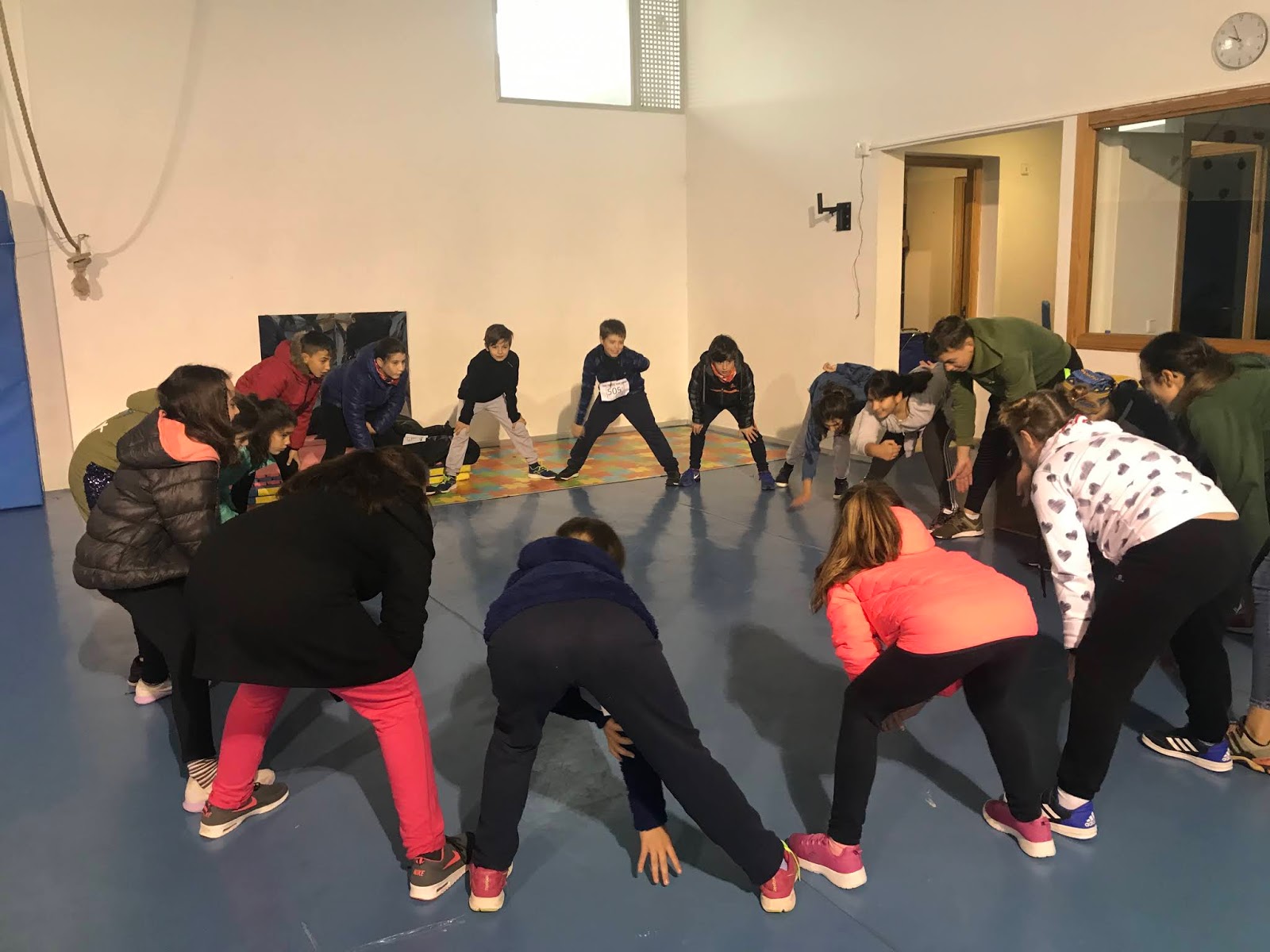ABANS DE LA CURSA UNS MONITORS I MONITORES ENS VAREN FER JOCS AL GIMNÀS PER ENCALENTIR.